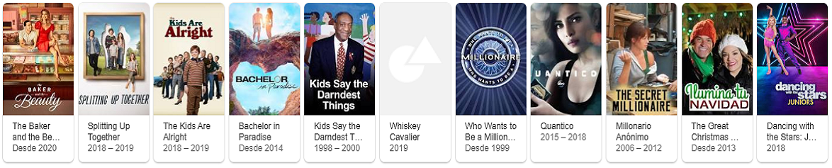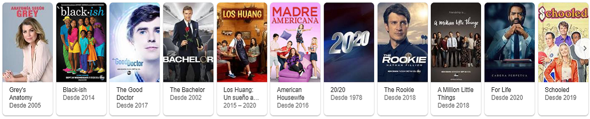 ABC Television Network es el hogar de la "Modern Family" ganadora del Emmy y de la comedia favorita "The Goldbergs"; fenómenos de realidad "Shark Tank" y "American Idol", así como el éxito de larga data "Dancing with the Stars"; "General Hospital", junto con el programa de entrevistas diurno "The View" y el programa de entrevistas nocturno "Jimmy Kimmel Live!" La red también cuenta con algunos de los programas de premios más prestigiosos de la televisión, como The Oscars, Country Music Awards, The American Music Awards y más. ABC Studios es líder en el desarrollo, producción y distribución estratégica de contenido de entretenimiento y es el proveedor de contenido clave para ABC Entertainment Group. Los éxitos actuales del estudio incluyen "Grey's Anatomy", "The Good Doctor", "American Housewife", "Speechless", "Marvel's Agents of SHIELD" y más series que se transmiten en otras redes.